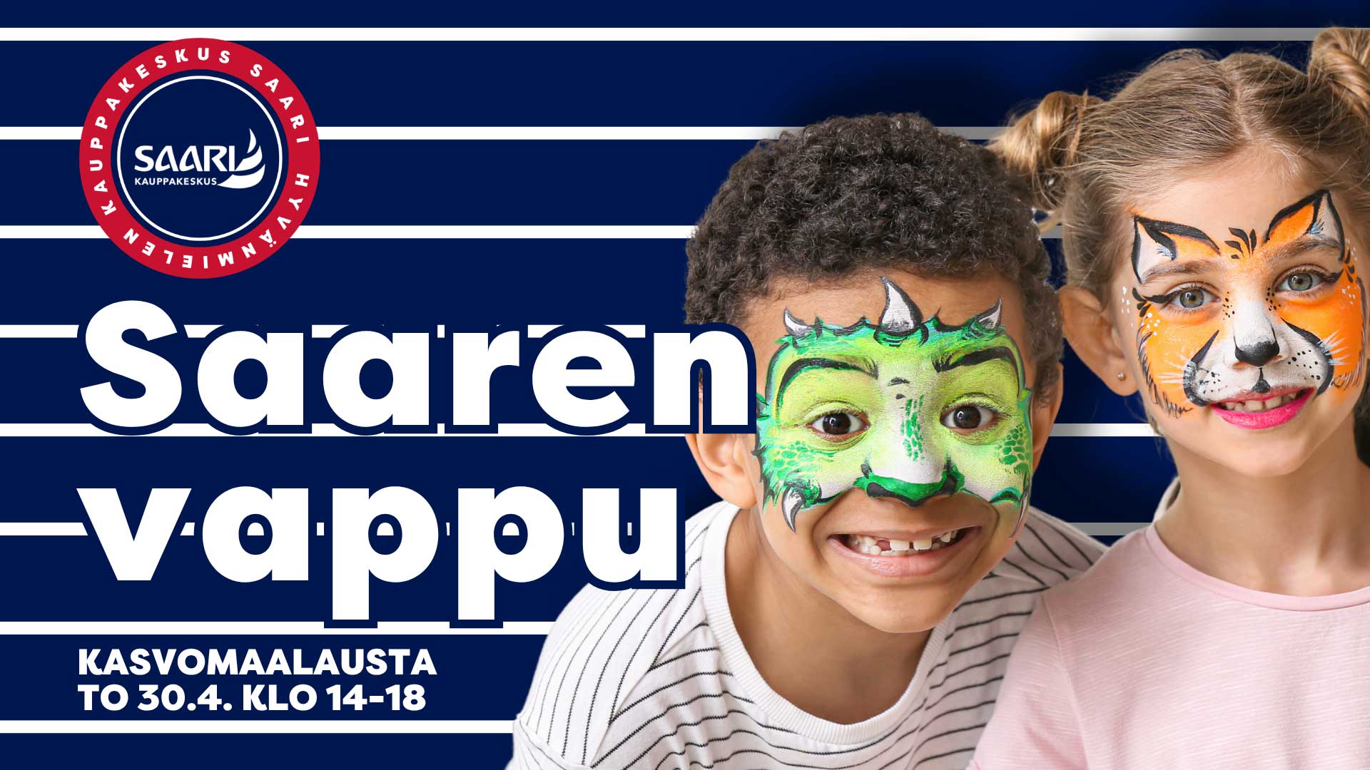 Vappuaattona 30.4. tuomme Kauppakeskus Saareen iloisen kasvomaalauspisteen, mistä perheen pienimmät voivat käydä hakemassa itselleen upeat, vapun teemaan sopivat kasvomaalaukset!